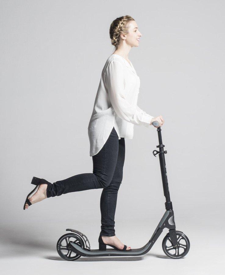 – Tryb wózka – po złożeniu hulajnoga przybiera kompaktową formę wygodną do ciągnięcia. Zajmuje mało miejsca w przechowywaniu.