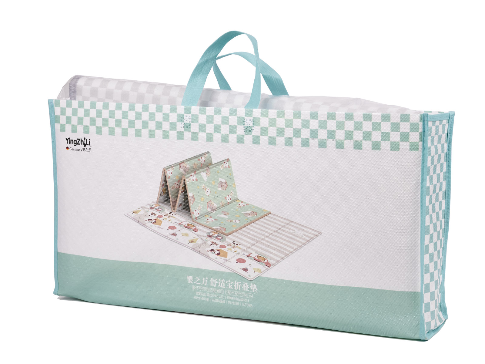 Złożona mata zapakowana jest w folię i poręczną torbę, dzięki które łatwo ją przetransportujesz. Świetny pomysł na prezent dla młodych rodziców!